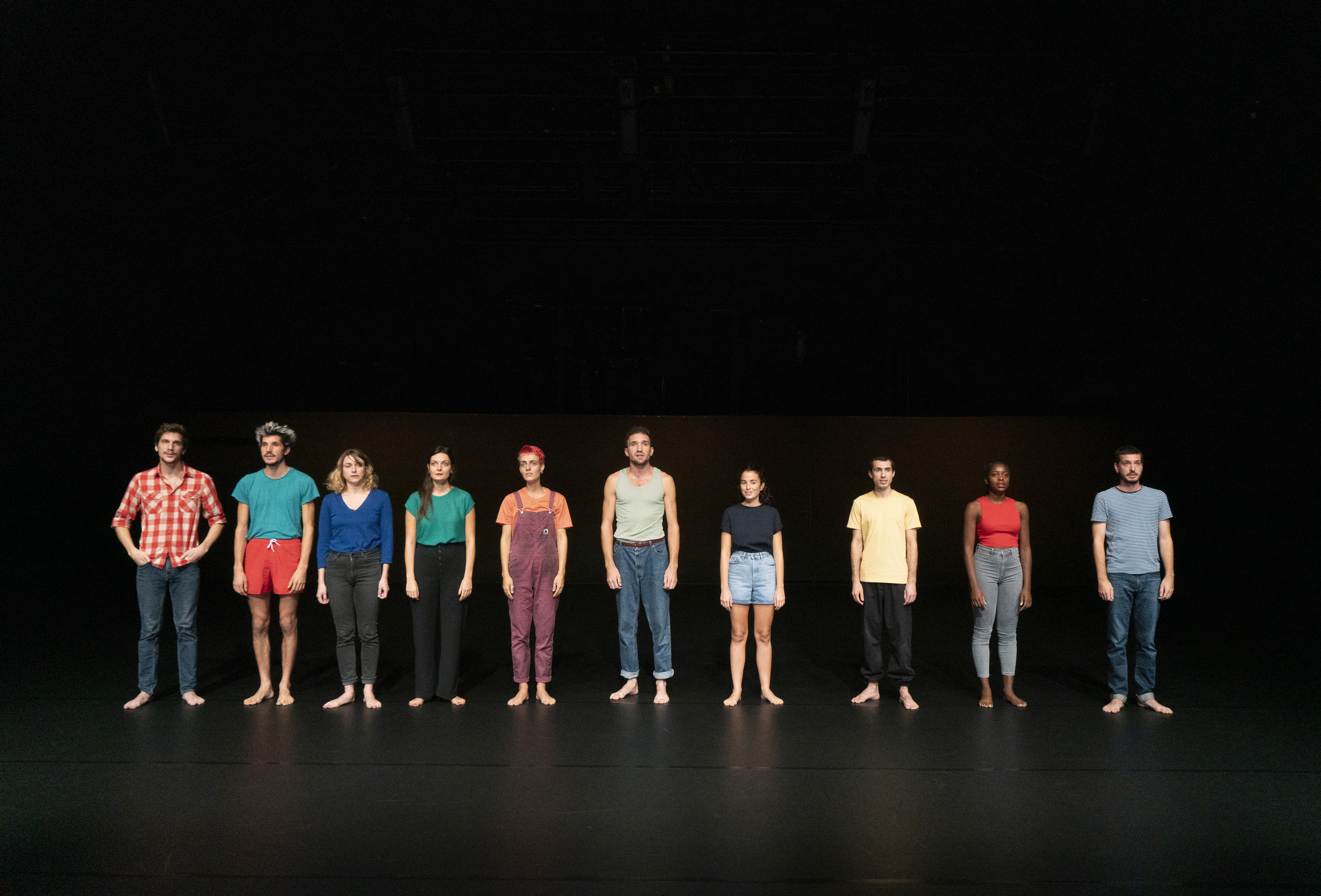 Lors de l’édition 2020 du Festival d’Automne dans le cadre du dispositif Talents Adami Théâtre, Fanny de Chaillé propose son spectacle Le Choeur. Il revient sur scène en 2022 pour réenchanter les spectateurs qui en ont besoin en cette difficile période. Dix jeunes comédiens et comédiennes forment un corps à 20 bras, 20 jambes, 10 têtes : Marius Barthaux, Marie Fleur Behlow, Rémy Bret, Adrien Ciambarella, Maud Cosset-Chéneau, Malo Martin, Polina Panassenko, Tom Verschueren, Margot Viala et Valentine Vittoz. Pieds nus, tenus simples, attitudes détendues, ils nous embarquent chacun leur tour dans une ou plusieurs histoires. Ne chercher pas à comprendre une récit qui se construirait progressivement. La grande Histoire se mêle aux petites histoires du quotidien. La metteuse en scène s’est inspirée du poème de Pierre Alféri « La Rue », qui servira de fil rouge. Les possibilité narratives permettent alors une liberté totale sur le pouvoir scénique du collectif. Une force qui va nous captiver de la première à la dernière minute.