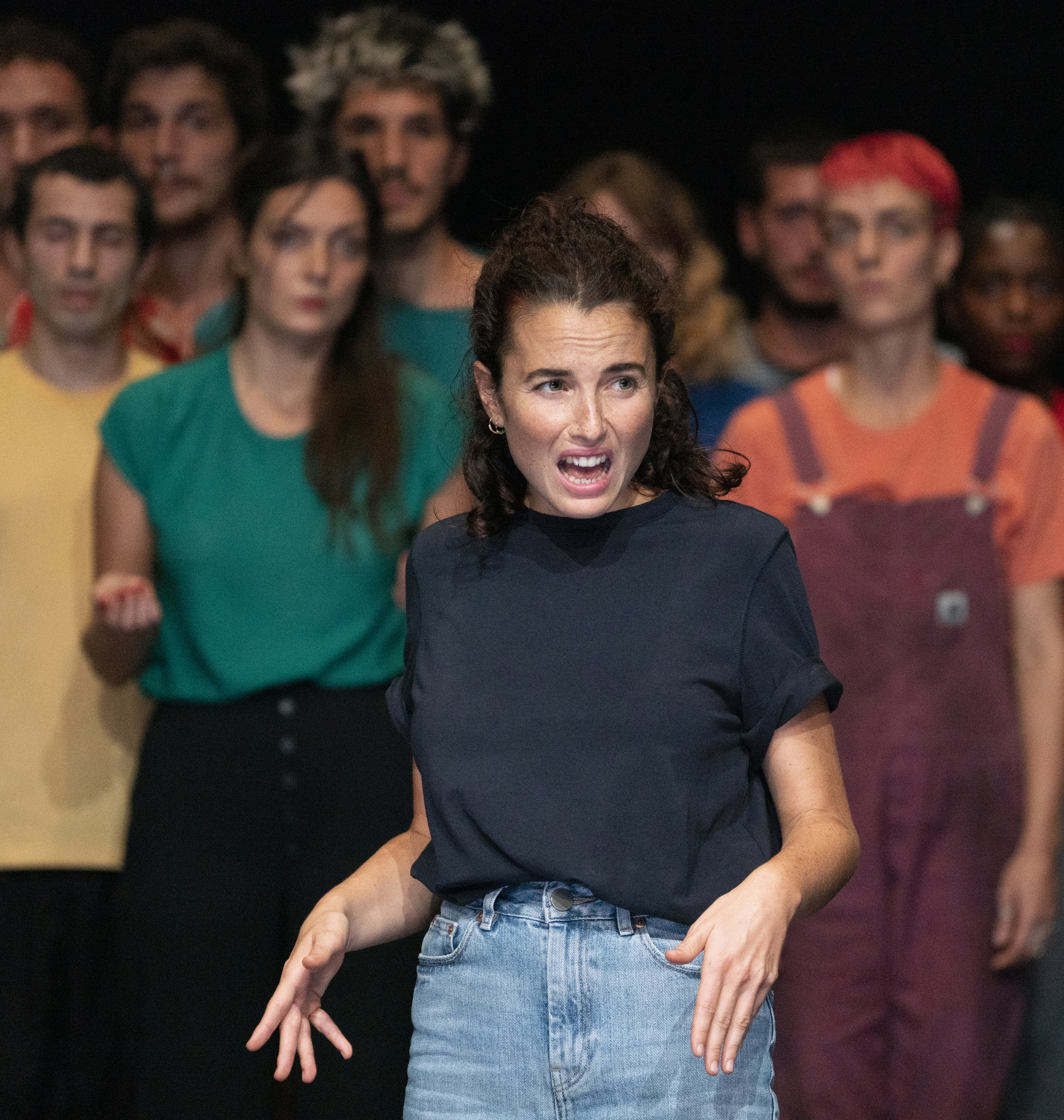 Lors de l’édition 2020 du Festival d’Automne dans le cadre du dispositif Talents Adami Théâtre, Fanny de Chaillé propose son spectacle Le Choeur. Il revient sur scène en 2022 pour réenchanter les spectateurs qui en ont besoin en cette difficile période. Dix jeunes comédiens et comédiennes forment un corps à 20 bras, 20 jambes, 10 têtes : Marius Barthaux, Marie Fleur Behlow, Rémy Bret, Adrien Ciambarella, Maud Cosset-Chéneau, Malo Martin, Polina Panassenko, Tom Verschueren, Margot Viala et Valentine Vittoz. Pieds nus, tenus simples, attitudes détendues, ils nous embarquent chacun leur tour dans une ou plusieurs histoires. Ne chercher pas à comprendre une récit qui se construirait progressivement. La grande Histoire se mêle aux petites histoires du quotidien. La metteuse en scène s’est inspirée du poème de Pierre Alféri « La Rue », qui servira de fil rouge. Les possibilité narratives permettent alors une liberté totale sur le pouvoir scénique du collectif. Une force qui va nous captiver de la première à la dernière minute.