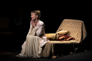 La mise en scène, en revanche, demeure plus classique, parfois figée dans une esthétique d’un autre temps. Les transitions sonores et lumineuses, bien que soignées, peinent à apporter une véritable respiration ou une tension dramatique. Le décor, minimaliste, laisse toute la place à la comédienne, mais manque d’audace pour soutenir pleinement le texte. La comédienne reste par exemple tout le temps en chemise de nuit comme pour insister que son espace est la chambre, isolée de tout. Cependant, cette simplicité permet paradoxalement de mieux mesurer la puissance du jeu, qui parvient à remplir le plateau d’une énergie fine. L’essence du théâtre est là avec une femme, une histoire, une voix. Et, malgré la sobriété scénique, ce portrait d’amour déraisonné finit par nous atteindre nous séduire car on ne voit jamais le temps passé.
