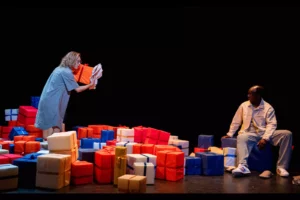 Le texte de Marius von Mayenburg, acerbe, incisif, déploie une langue vivante entre le quotidien et l’abîme. Le spectacle exploite pleinement la scénographie grâce à ces montagnes de cadeaux jamais ouverts pour montrer que l’hypocrisie du don peut devenir une arme silencieuse. Ces cadeaux épousent le rythme de la joute verbale, siège ou arme, les deux? Malgré la densité, on ne perd jamais pied. Nous sommes happés, captifs de la verticalité psychologique de ce face-à-face tendu.