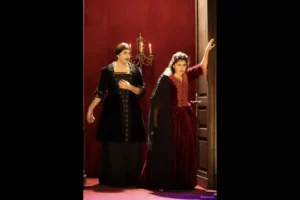 Sur la scène, la tragédie s’installe dans un décor d’un autre siècle avec dorures, peintures et cheminée. L’ambition semble être de revisiter un grand classique avec respect, sans fioritures ni modernité forcée. Pourtant, la passion attendue peine à naître et la salle s’enfonce dans une lenteur pesante.