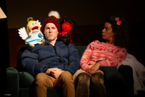 L’espace scénique, conçu comme une cocotte-minute, bascule progressivement vers l’hystérie. Le salon devient un champ de bataille, les objets se rebellent, les gestes dérapent, tout file vers un chaos parfaitement coordonné. La création lumière et sonore de François Duguest amplifie les tensions, jouant de contrastes et d’éclats pour créer un climat instable, presque irréel. Les corps sont projetés dans des situations de plus en plus incontrôlables où la moindre étincelle devient un embrasement. La satire touche juste. Les rituels familiaux s’effondrent, les conventions explosent, les mythes fondateurs prennent un coup fatal. Père Noël, Jésus ou encore le diable deviennent les jouets d’un humour ravageur qui ne s’interdit rien. On se laisse happer par cette folie orchestrée avec minutie.