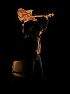 La mise en scène de Mathilde Wind, est d’une ingéniosité redoutable. Elle transforme un simple bureau d’hôpital en un terrain d’enquête, de confidences et de rock incandescent. Les marquages au sol dessinent les espaces, les transitions, les gestes médicaux convoqués par l’imagination du public. La guitare électrique accompagne les pulsations du récit, la bande-son d’Arthur Chrisp mêle bruits hospitaliers, respiration musicale et archives féministes, créant une texture sonore immersive. Le plateau, entre documentaire et performance, joue avec la frontalité. La gynécologue s’adresse directement à nous, brouillant les frontières entre fiction et témoignage. Les sons d’archives viennent ancrer la narration dans l’histoire politique des droits des femmes, rappelant combien ces conquêtes sont récentes, fragiles, constamment menacées. Une énergie farouche, brûlante, traverse le spectacle, offrant un théâtre de conviction qui ne craint pas de secouer.