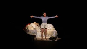 La dynamique scénique repose sur une énergie flamboyante, presque rebelle, qui n’a besoin d’aucun artifice pour capter l’attention. Quelques accessoires suffisent à créer un univers complet, où chaque geste raconte davantage que mille explications. Elle ose se montrer vulnérable, apparaissant en sous-vêtements, revendiquant ainsi un rapport libre et assumé au corps, qui devient un vecteur d’expression et non un objet de regard. Les ruptures de ton, habilement orchestrées, soulignent la confusion intérieure d’une femme qui croyait connaître la voie à suivre. Le récit s’ouvre progressivement, révélant que l’amour véritable ne se choisit pas selon des critères religieux mais selon une vérité intime difficile à admettre. L’humour ne masque jamais les blessures. C’est précisément ce mélange de légèreté et de profondeur qui rend l’ensemble si riche. Sa parole brille par son franc-parler et sa finesse, créant un lien direct, presque complice, avec le public.