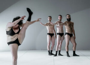 Un sol blanc, un fond blanc et des présences qui apparaissent l’une après l’autre, simplement vêtues d’un cycliste noir et de chaussettes noires. Trois hommes aux morphologies distinctes entrent en scène, suivis d’une femme en maillot noir qui cherche sa place parmi eux. Aucun mot n’est prononcé, pourtant tout commence déjà à se dire. Le public, spontanément, se surprend à suggérer des ajustements, à vouloir rééquilibrer les silhouettes. Ce jeu révèle avec finesse nos réflexes conditionnés face aux corps. Ici, pas de silhouettes standardisées ni d’esthétique calibrée. Les différences deviennent richesse, les singularités s’affirment. Les visages détendus, les petites dissensions du groupe, les hésitations assumées créent une proximité immédiate. Le rire surgit, sincère et partagé et jamais dans la moquerie ou l’humiliation de l’autre. La diversité visible sur scène agit comme un miroir bienveillant de la société.