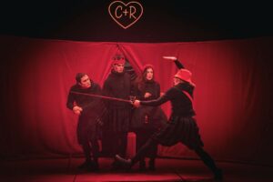L’espace scénique contribue à cette vitalité avec une inventivité réjouissante. Une arène ovale entourée de lourds rideaux rouges crée une proximité presque électrique, invitant au duel autant qu’à la confidence. Les ouvertures latérales permettent surgissements et surprises, donnant au plateau une mobilité permanente. Tout comme les interventions des vignons qui donnent des informations complémentaires. Au-dessus de tout ça, un néon en forme de cœur portant les initiales des amants s’allume ou s’éteint selon les rebondissements, clin d’œil romantique détourné avec humour. Cette scénographie simple et astucieuse amplifie l’énergie des situations. Les effets lumineux accompagnent les bascules d’époque et soutiennent les séquences plus contemporaines avec précision. Le dispositif assume la fantaisie tout en respectant la dramaturgie. L’ensemble respire, circule, pulse et enivre, à sa façon.