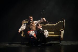 La véritable force du spectacle repose sur l’énergie du collectif, une énergie qui circule du plateau à la salle avec une aisance réjouissante. Les comédiens développent une complicité visible qui donne au texte une spontanéité bienvenue, comme si Wilde avait écrit pour eux. Les changements d’attitudes, les différents registres de jeu, les éclats d’humour parfaitement dosés créent un relief continu qui empêche toute monotonie. La lumière, de Stéphane Balny, accompagne ces variations, sculptant les visages ou durcissant l’atmosphère lorsque le portrait se charge d’horreur intérieure. Chaque transition devient alors un petit choc esthétique, une respiration ou une secousse qui relance le mouvement dramatique. Les costumes, richement travaillés, évoquent la sophistication victorienne tout en laissant place au jeu physique des acteurs. Ce soin visuel apporte une cohérence qui renforce le charme général de la mise en scène de Thomas Le Douarec. On sent qu’il connaît ce texte de l’intérieur, qu’il en maîtrise les codes et les sous-entendus. Même les moments plus sombres restent enveloppés dans une douceur étrange, comme si la pièce cherchait toujours à préserver une forme d’élégance.
