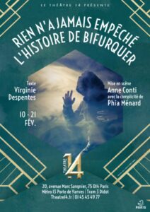 Tout part d’un moment réel avec un séminaire au Centre Pompidou, un texte inédit de Virginie Despentes et un appel à faire dévier la trajectoire du monde. Anne Conti s’empare de cette parole incandescente et la transforme en expérience sensorielle. Elle ne déclame pas. Elle incarne les mots. Chaque phrase devient matière vivante, respiration et tension musculaire. Les mots sur la frontière, la domination, la liberté des corps s’élèvent et se heurtent à l’air comme des éclats. La comédienne évolue dans un décor de décombres qu’elle manipule, déplace et assemble. Des fragments surgissent des possibles. La ruine devient atelier et terrain d’invention. Les débris se transforment en sculptures éphémères, en architectures fragiles. On assiste à une métamorphose continue où la pensée prend forme sous nos yeux. L’énergie est rock, la poésie affleure, la colère gronde puis s’ouvre sur une tendresse inattendue. L’espace laisse place à l’imaginaire, chacun est invité à envisager sa propre révolution.